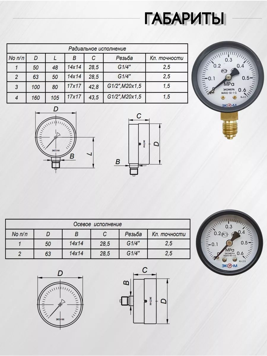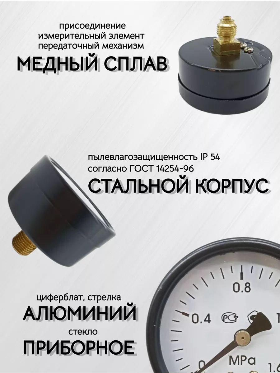 Диаметр 50 мм, Давление 0-1,6МПа, Тип резьбы G1/4, Тип подключения - Осевое, Класс точности 2,5, Степень защиты IP54