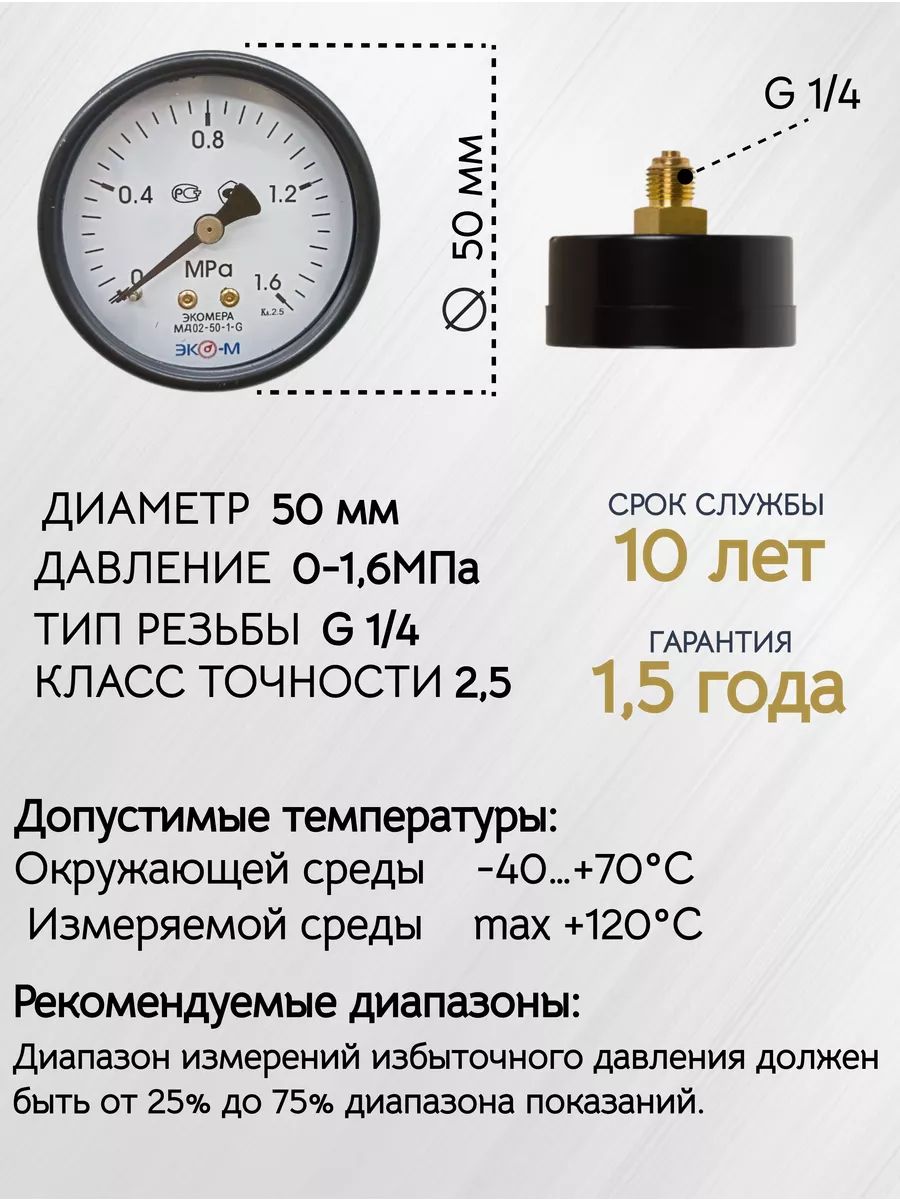 Рекомендуемые диапазоны: Диапазон измерений избыточного давления должен быть от 25% до 75: диапазона показаний. Диапазон измерения вакууметрического давления должен быть равен диапазону показаний. Присоединение - Медный сплав, штуцер сзади (осевое исполнение), Измерительный элемент - Трубчатая пружина, медный сплав, Передаточный механизм - Трибко-секторный, медный сплав, Корпус - Стальной, черного цвета, пылевлагозащищенность IP 54 согласно ГОСТ 14254-96, Циферблат - Алюминиевый, белого цвета, с ограничительным шрифтом, шкала черного цвета, Стрелка - Алюминиевая, черного цвета, Стекло - Органическое, Кольцо - сталь черного цвета, Межповерочный интервал - 2 года, Гарантия - 18 месяцев с даты ввода в эксплуатацию, а при ее отсутствии – 2 года с даты первичной поверки, Средний срок службы - 10 лет.