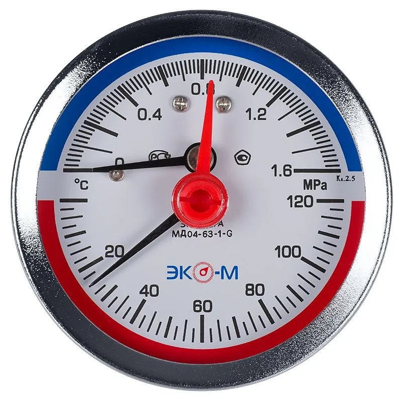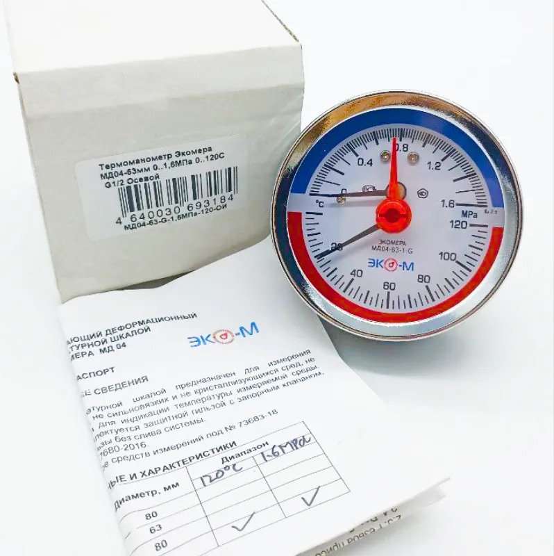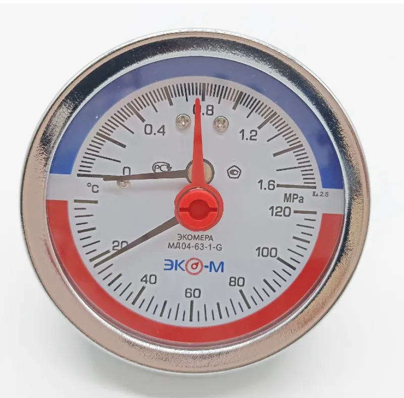 Термоманометр Экомера МД04-63мм 0..1,6МПа 0..120С G1\4 с переходником на G1\2 Осевой