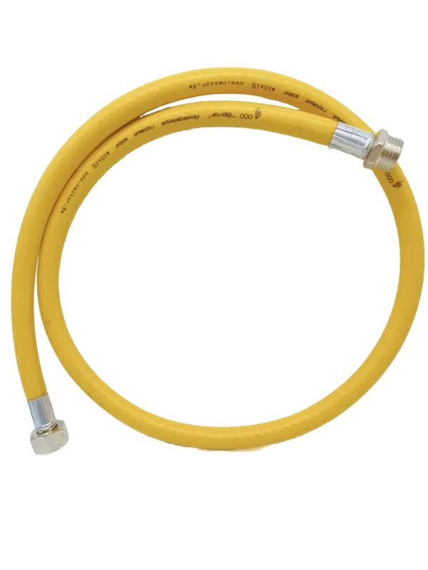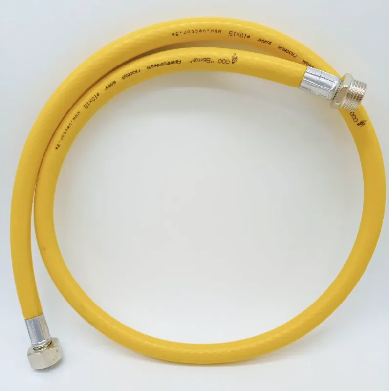 подводка для газа изготавливается из трех слоев, внешний слой желтого цвета из термостабильного поливинилхлорида, внутренний слой из поливинилхлорида устойчивого к газовой среде, с армированием полиэфирной нитью, и концевой арматурой из железоуглеродистой стали с резьбой 1/2 дюйма.