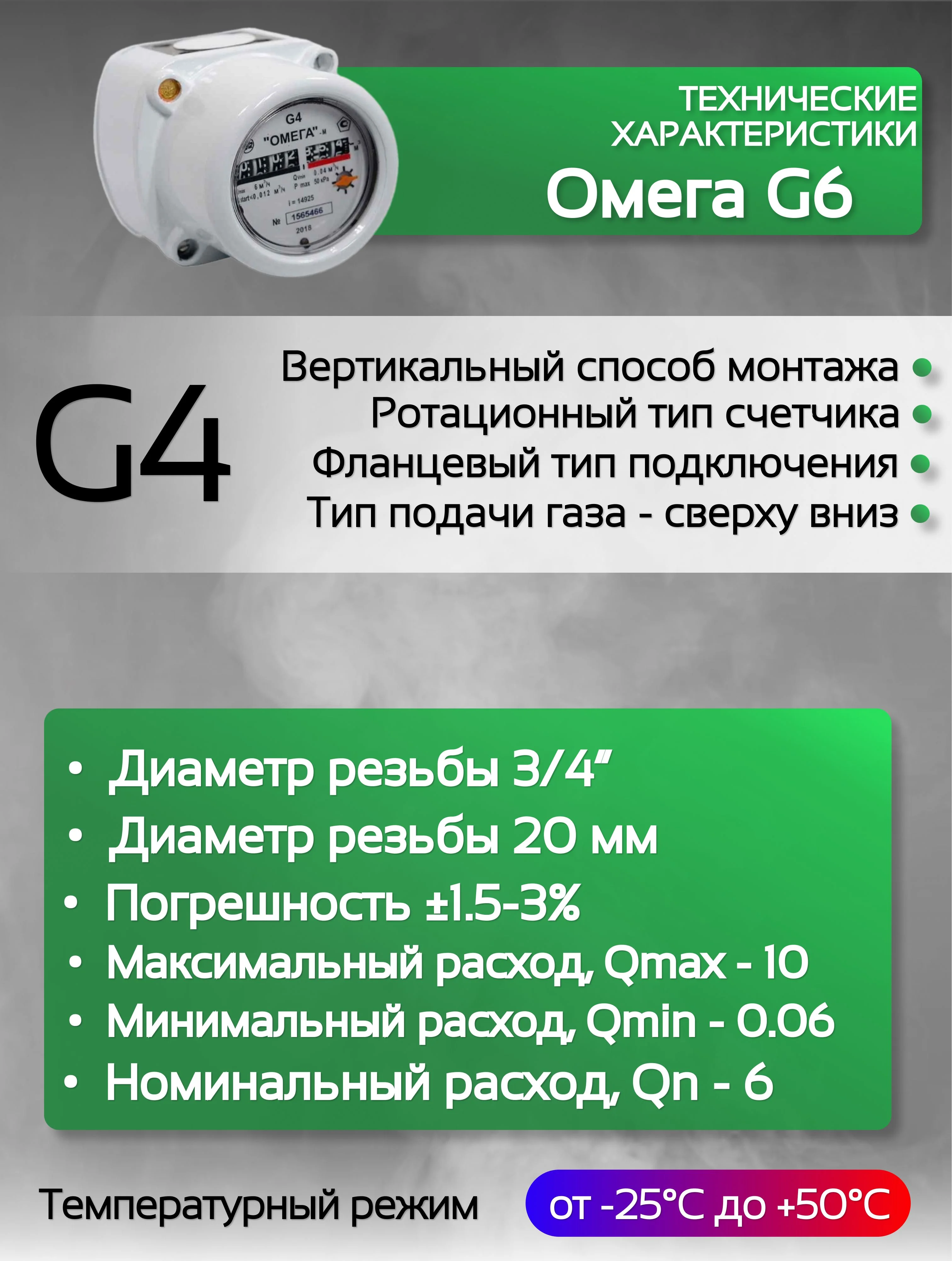 Основные преимущества счетчиков газа ОМЕГА G6: малогабаритный, современная конструкция и лаконичный дизайн, автономная функция самоочистки, надежность и безопасность при эксплуатации, стабильные метрологические характеристики на протяжении всего срока службы, стойкие к влажности окружающего воздуха до 98 % при температуре 25 ° С, невероятно просты в обращении и обслуживании, легко и надежно монтируются в газовую систему, сетчатый фильтр и штуцера входят в комплект счетчика.