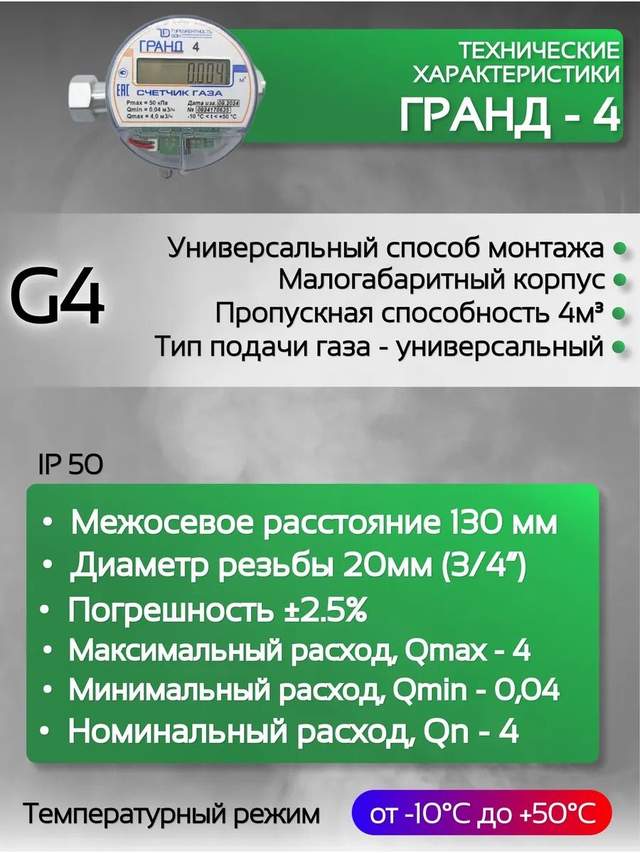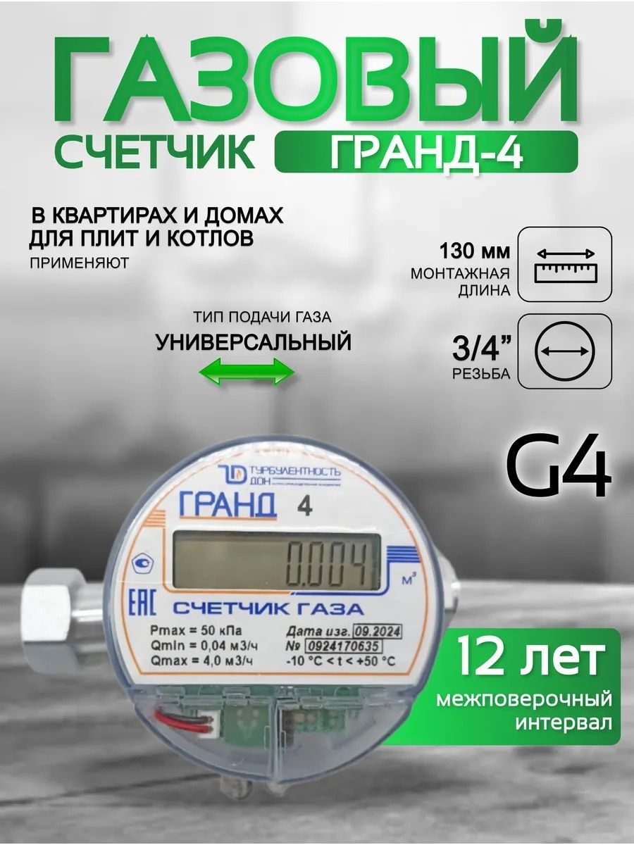 Счетчик газа Гранд 4 ДУ20 130мм предназначен для точного измерения и контроля потребляемого количества природного газа по ГОСТ 5542-87 или паров сжиженного углеводородного газа по ГОСТ 20448-90, используемых в бытовых и производственных целях. Данный бытовой счетчик газа предназначен для использования в доме, в квартире, для газовых плит, котлов и колонок.
