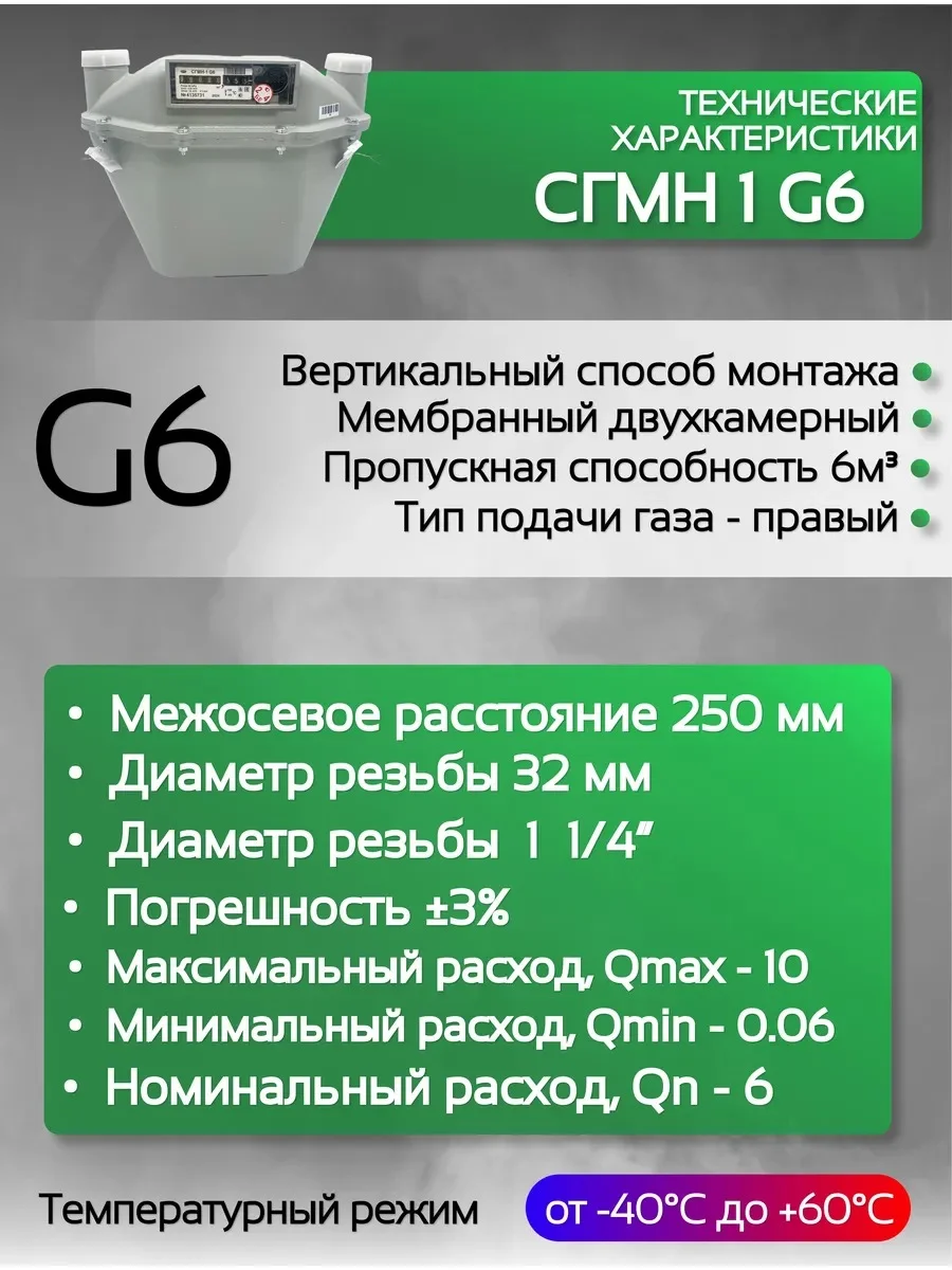 Счетчик газа диафрагменный с термокомпенсатором СГМН 1 G6 левый (250мм, 1 1/4")