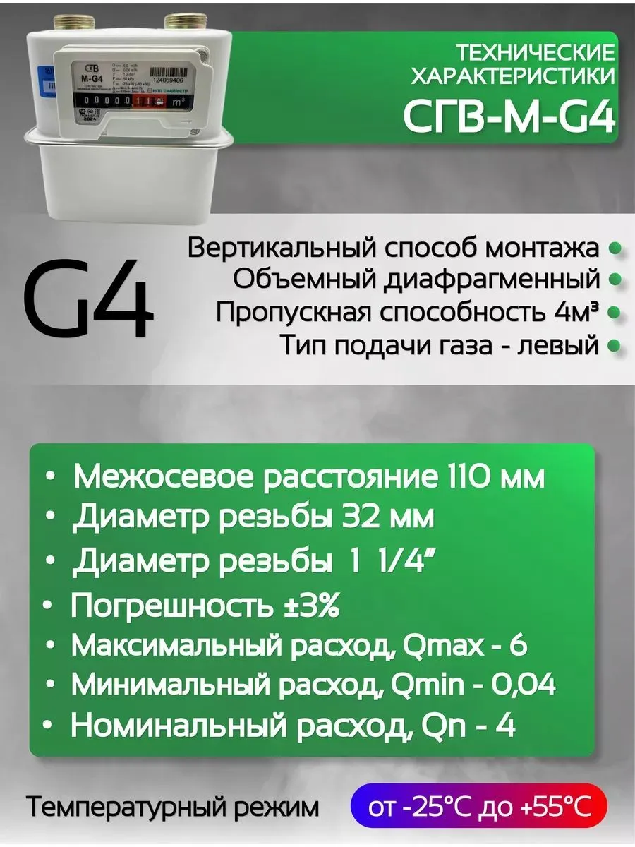Бытовые диафрагменные счетчики газа СГВ М/МТ предназначены для измерения потребления природного газа, газообразных пропана, бутана или их смесей и других неагрессивных газов. Счетчики применяются в бытовом учете газа, выпускаются в рзличных модификация по ДУ присоединения: 1 1/4