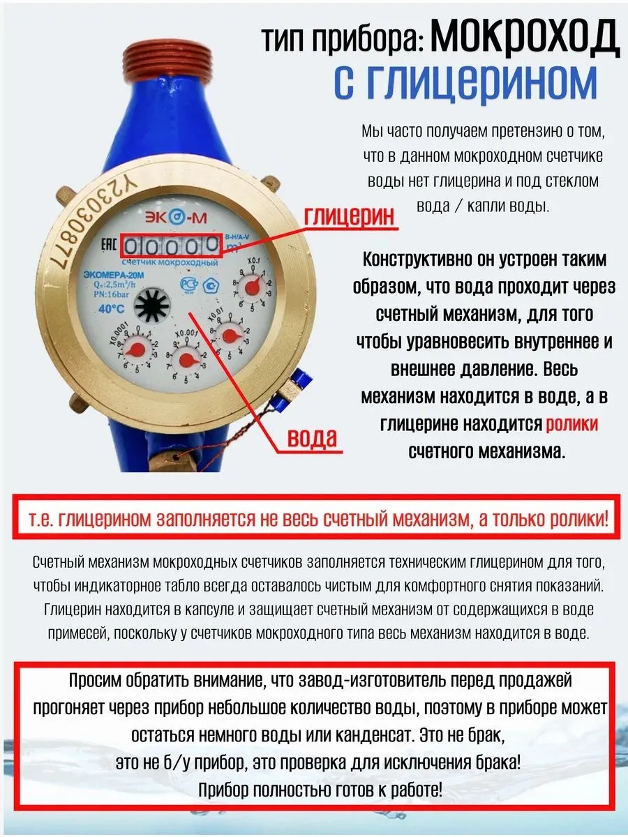 Счетный механизм заполнен техническим глицерином, что позволяет индикаторному табло всегда оставаться чистым для комфортного снятия показаний.