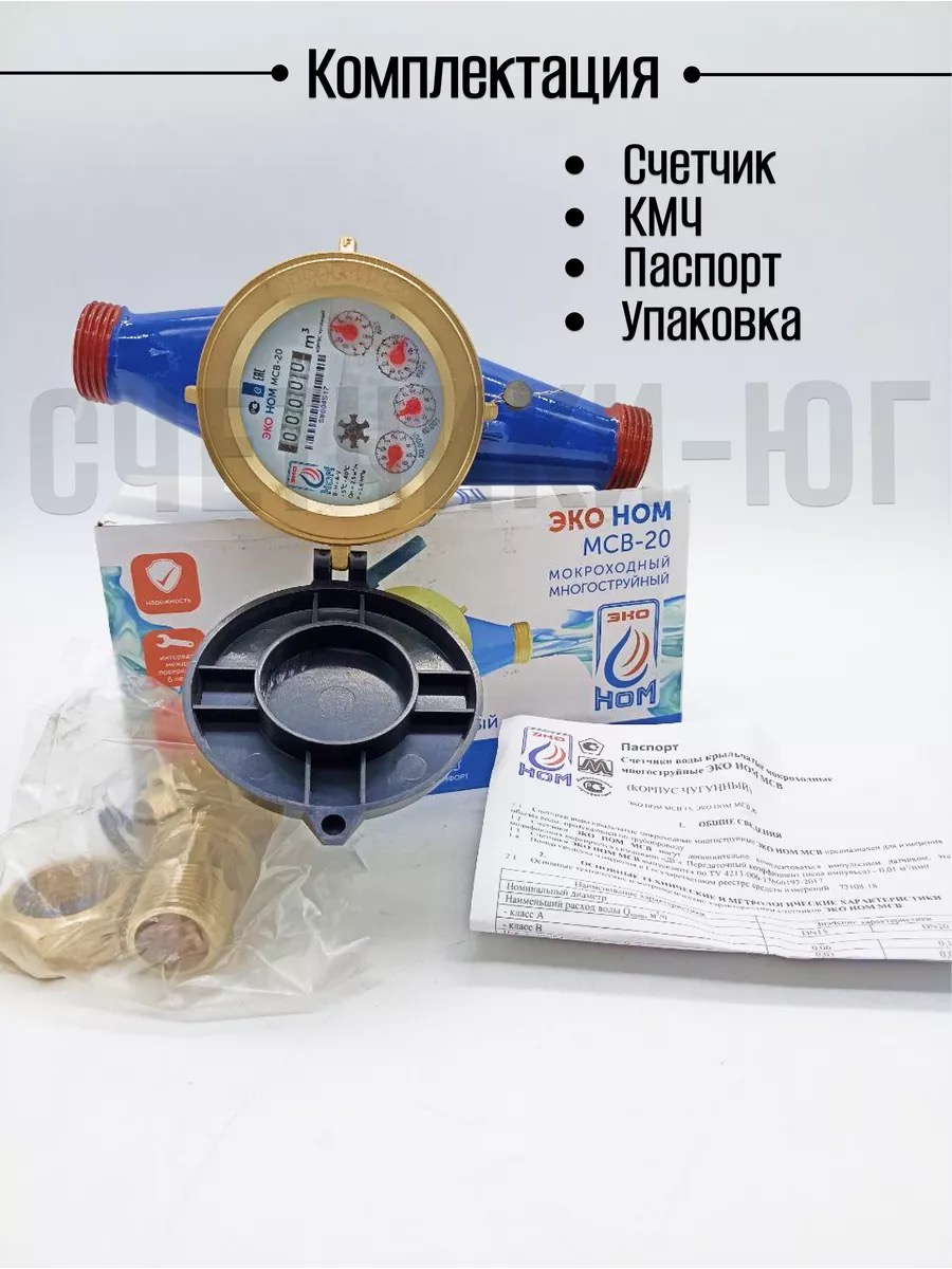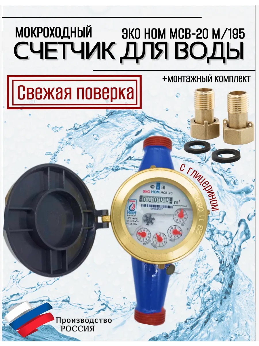 Счетчик воды мокроходный многоструйный ЭКО НОМ МСВ-20 М+КМЧ (195), с комплектом монтажных частей (с КМЧ) - штуцер с накидной гайкой.