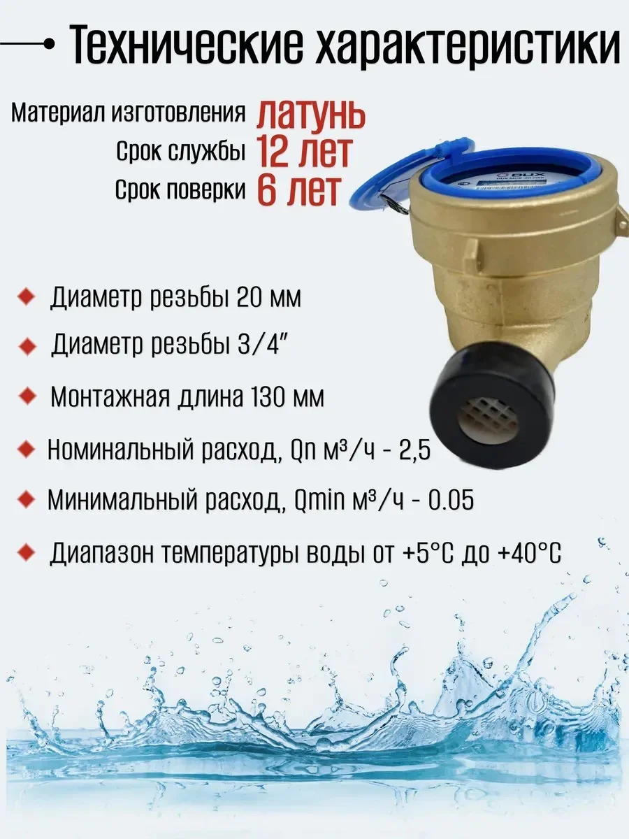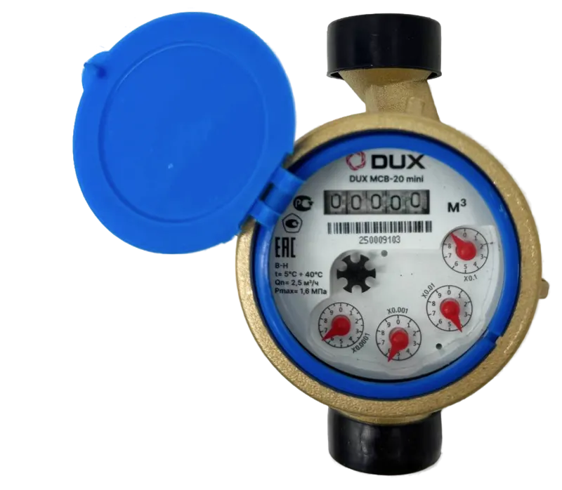 Счетчик воды мокроходный одноструйный DUX МСВ-20-130-mini (латунь), класс А/В + КМЧ без ОК