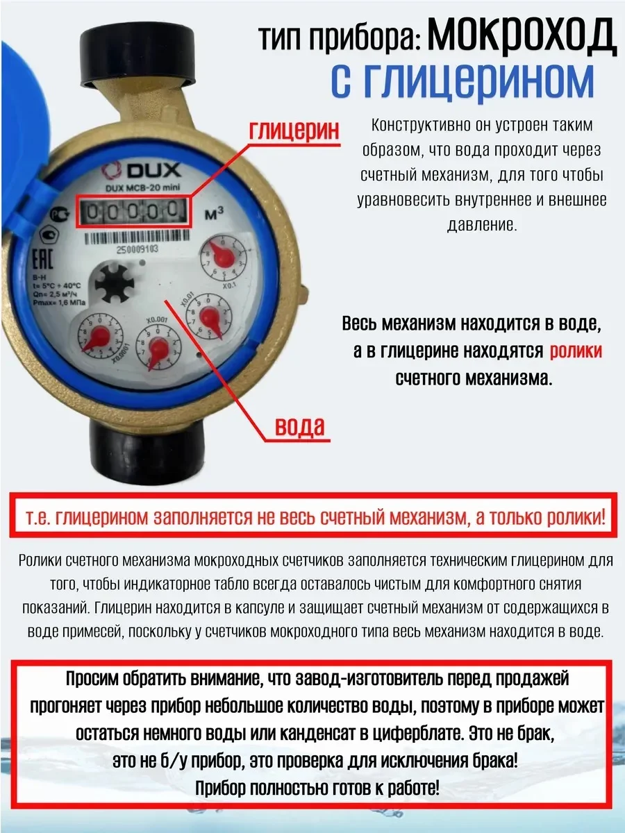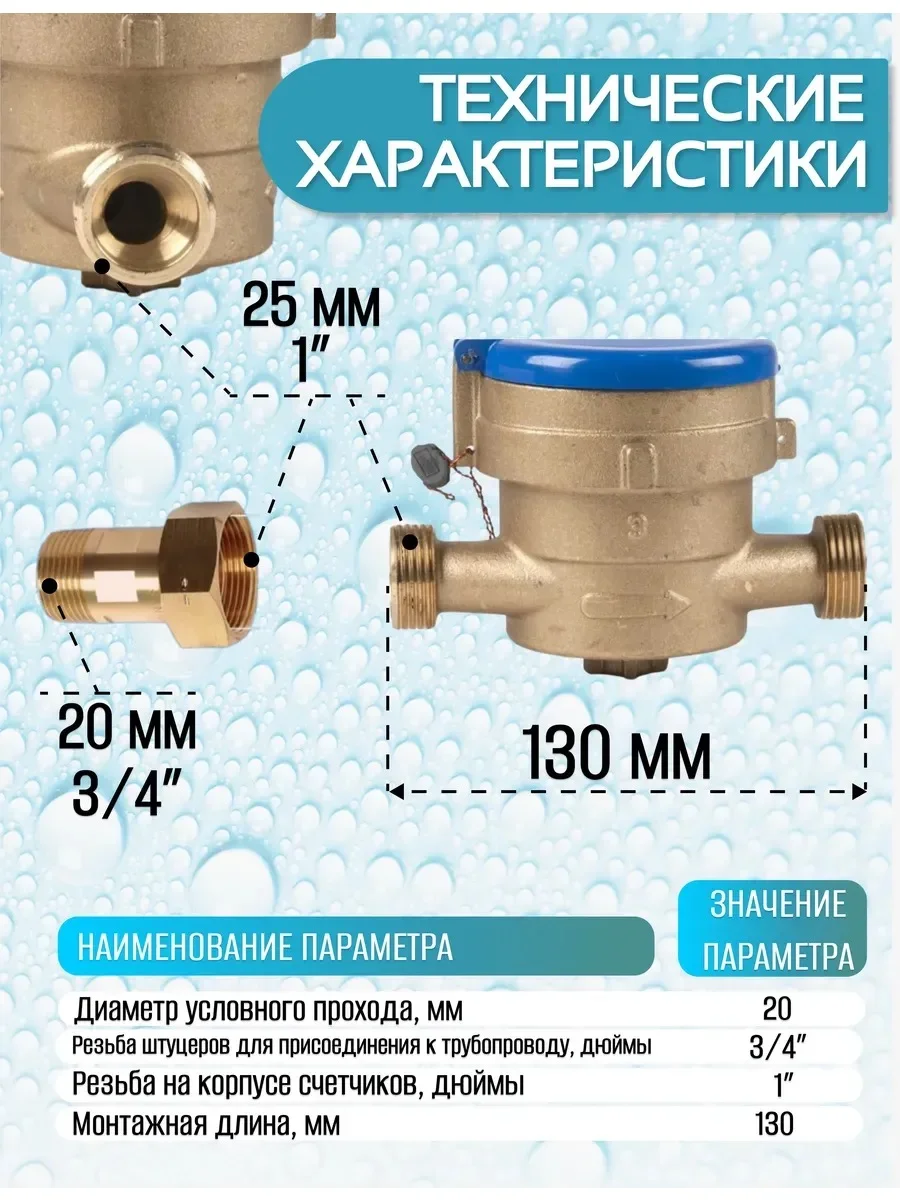 Отличительная особенность данного расходомера - счетный механизм заполнен техническим глицерином, что позволяет индикаторному табло всегда оставаться чистым для комфортного снятия показаний. Корпус мокроходного счетчика на воду выполнен из латуни, герметичен и выдержит 1,6МПа. Счетный механизм закрыт толстым стеклом. Сгон на теле измерителя расхода водоснабжения 1 дюйм, а с кмч - 3/4"