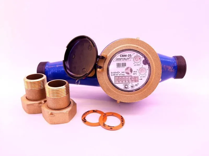 Счетчик холодной и горячей воды многоструйный крыльчатый СВМ с диаметром условного прохода 25, изготовленные по техническим условиям ВИАД 2.833.007 ТУ предназначен для измерения объемов питьевой воды по СанПиН 2.1.4.559-96, протекающей в системах холодного и горячего водоснабжения при температуре от +5 до +90°С и давлении до 1,0 МПа (10 кгс/см2).Счетчики имеют индикаторное устройство с роликовыми и стрелочными указателями, показывающими измеренный объем в кубических метрах и долях кубического метра.