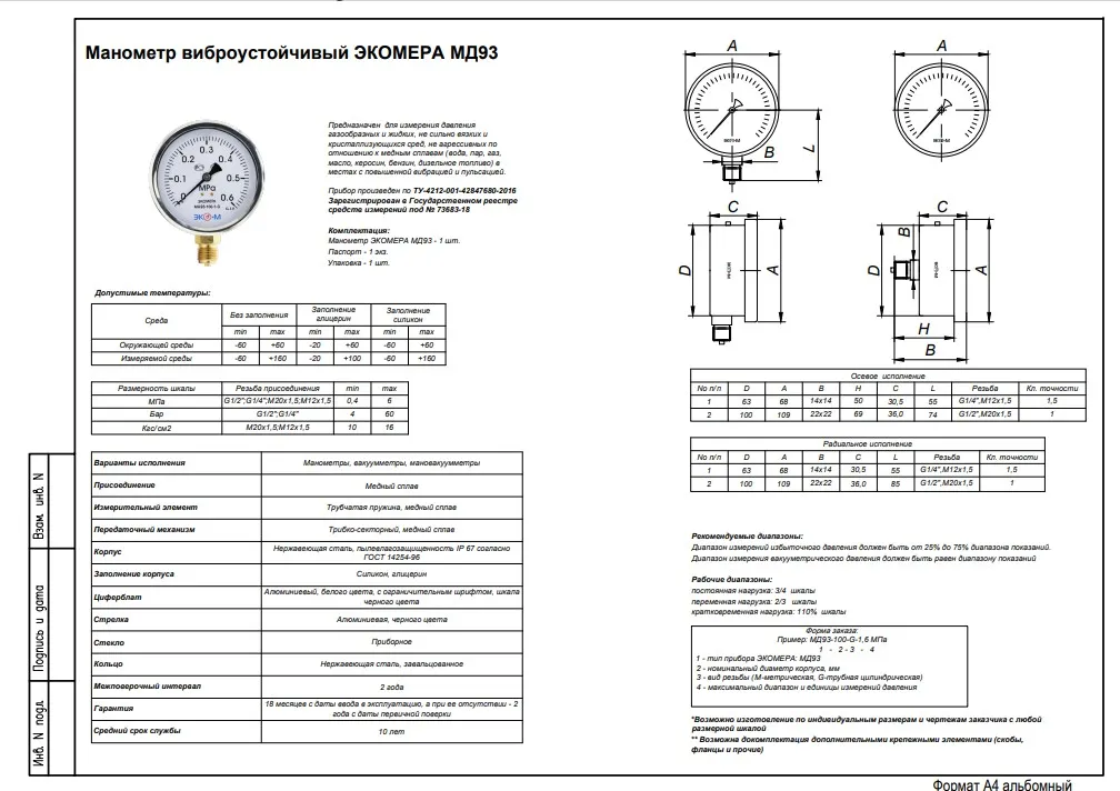 Манометр виброустойчивый ЭКОМЕРА МД93