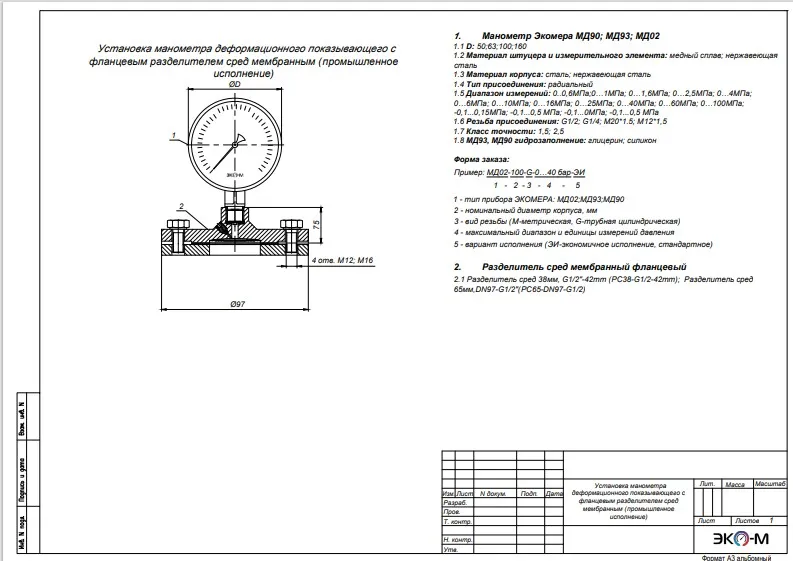 Манометр Экомера МД90; МД93; МД02